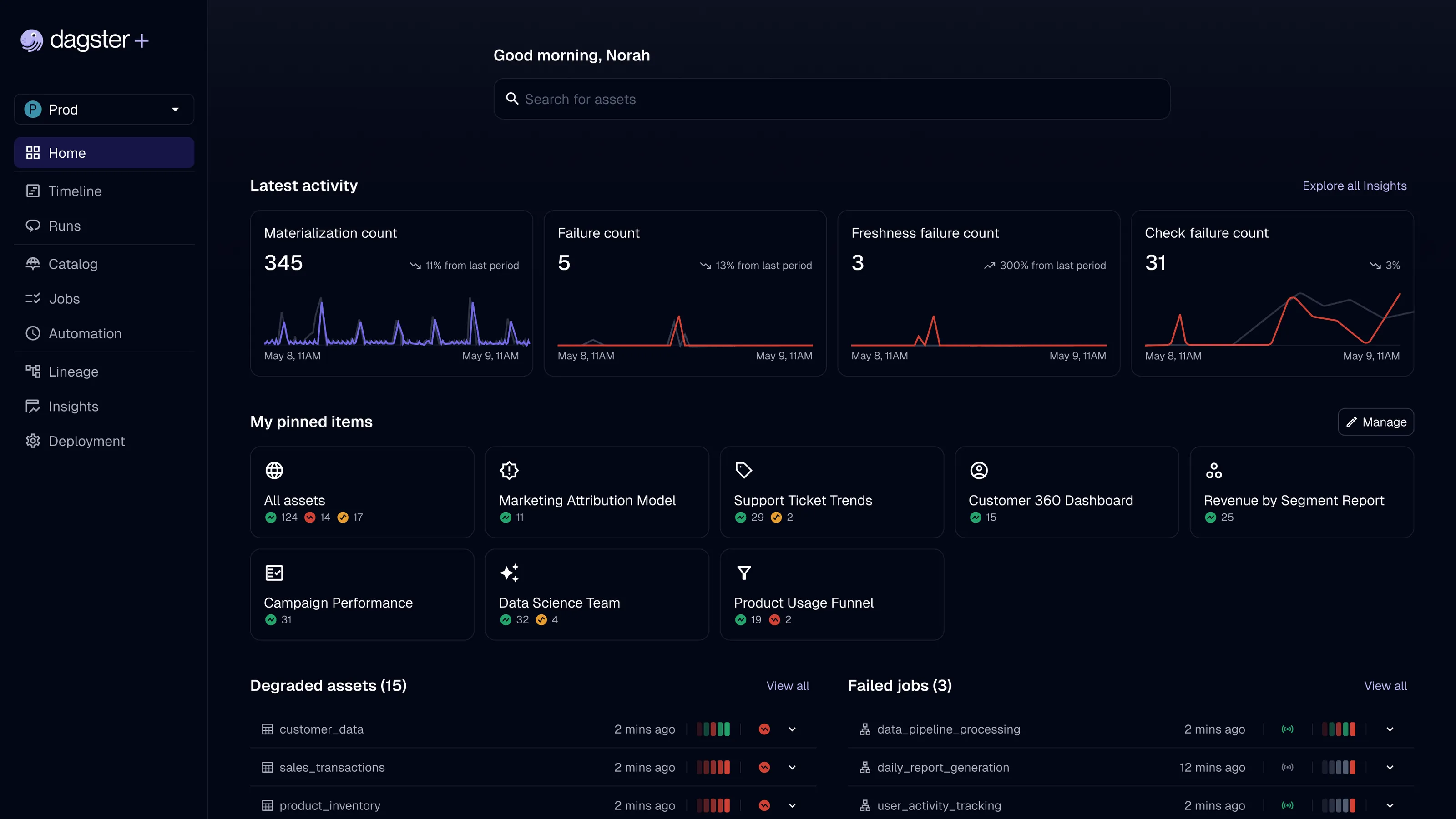 Preview new Dagster+ features including freshness and asset health monitoring, a redesigned asset catalog, and realtime insights.