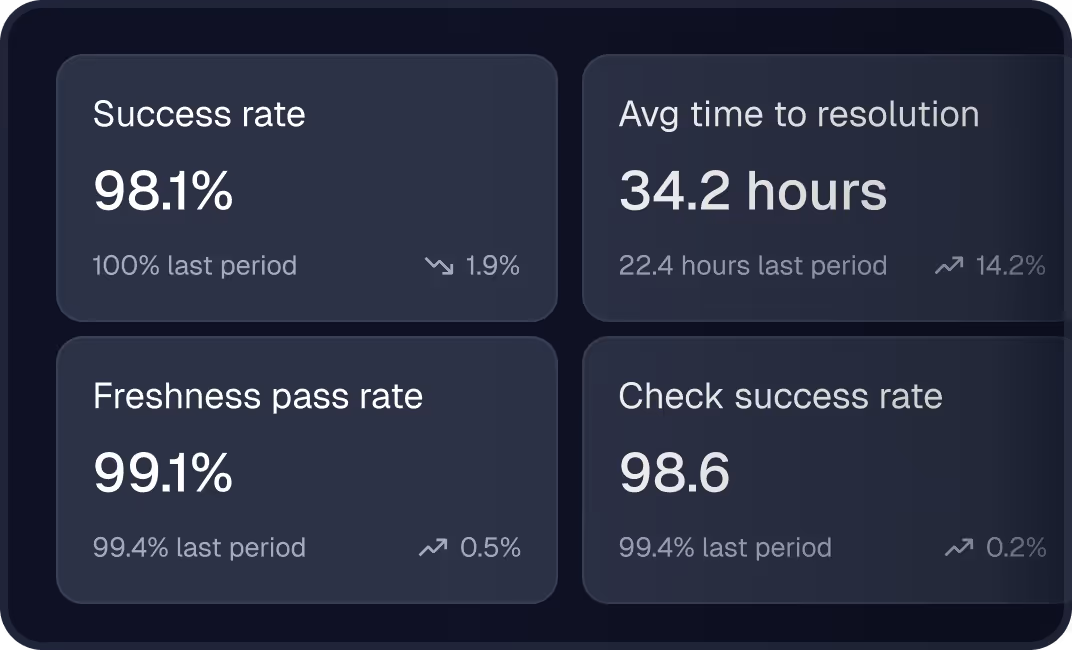 Unlock a comprehensive, dashboard-style view of your data platform’s health. The new Insights experience surfaces critical metrics, like success rate, freshness hit rate, and time to resolution for any selection of assets – all in real time.