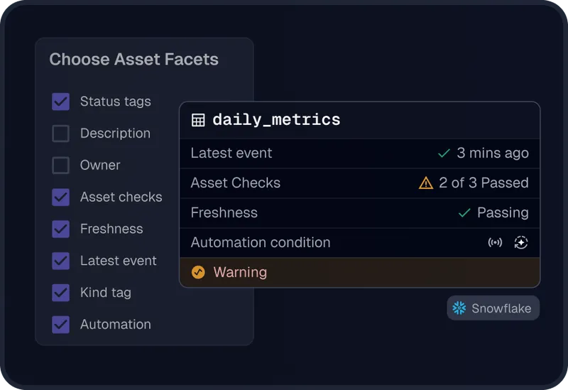 Make smarter decisions faster with customizable lineage views that surface the most relevant metadata, like ownership, health, freshness, and automation signals right where your team needs it.